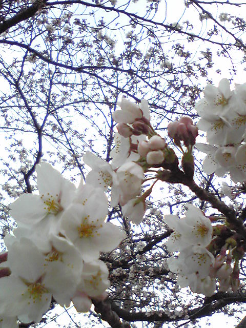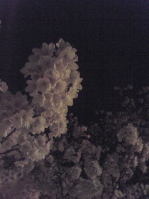 これは金曜夜に撮った桜。ライトアップなしで街灯のみ。最近のケータイのカメラはそれでも映るんだからすごい(ただ、最近まで夜景モードがあることに気づかなかった)。