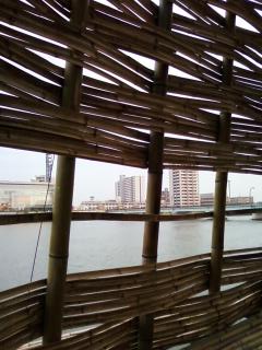 中から信濃川を窺う。床も竹で隙間から川の一部が見えて、ちょっと怖かった。